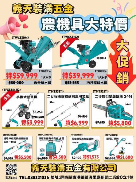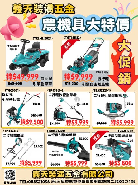 **農機具特惠來啦!** 補庫存、換新機,就是現在最划算的時機!