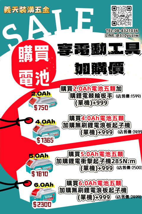 TOTAL電池 : 小容量、大容量任你選~ 🛒 購買'同Ah電池'五顆﹐加購電動工具都只要 $999 2.0Ah x5 : $3750 4.0Ah x5 : $6825 5.0Ah x5 : $9050 6.0Ah x5 : $11500 門市售價 : 棘輪板手(單主機)$1599 &n...