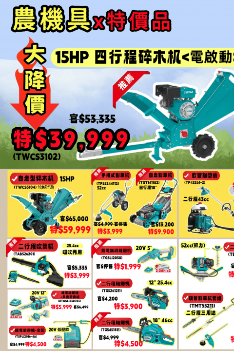 您沒看錯﹐我們也有農機商品。 眾多商品TOTAL官網漲價﹐義天都沒有調漲唷!! 農機具限時優惠 割草機|碎木機|噴霧機|背負式工具|吹葉機 鋰電/油式 通通有特價! 想看現貨、想試機都歡迎! 單割草機就有 : 背...